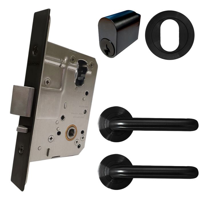 The LOCKTON 60mm Round Rose Mortice Lock KIT 1 Black (CLASSROOM) contains a LOCKTON 60mm Backset Mortice Lock, Oval Cylinder and suitable furniture, all with Matte Black Finishes.