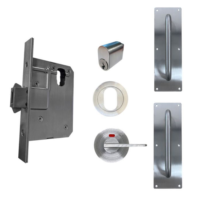 The LOCKTON 60mm Sliding Round Rose Mortice Lock KIT 6 (INDICATING DA & CYLINDER) contains a LOCKTON 60mm Backset Sliding Mortice Lock, Oval Cylinder, Pull Plates and suitable furniture.