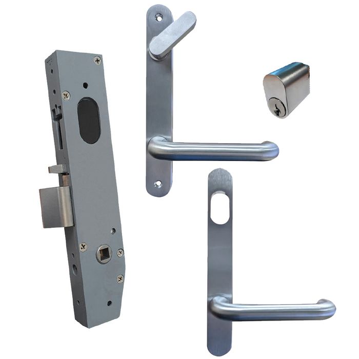 This is a Round Furniture Kit that contains a 23mm Backset Mortice Lock, Cylinder and Suitable furniture for use in "Disability" configuration.