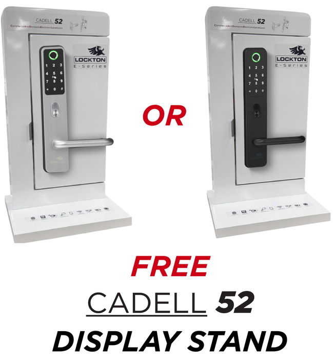 | 1 | CADELL52-DISP | LOCKTON 'E-Series' CADELL52 Dealer Display Stand, comes fitted with fully functioning CADELL52 Smart Door Lock on a stylish timber display mount (available in Black or Satin Stainless Finish, select from dropdown menu). |