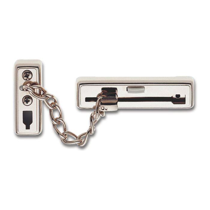 This high quality door chain comes fitted with a built-in spring to prevent accidental opening along with a child safety device.