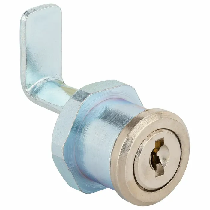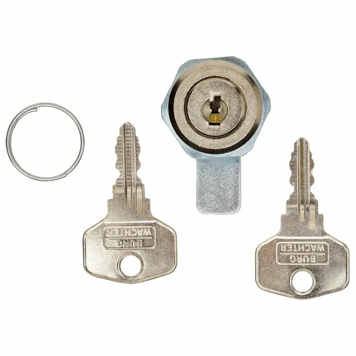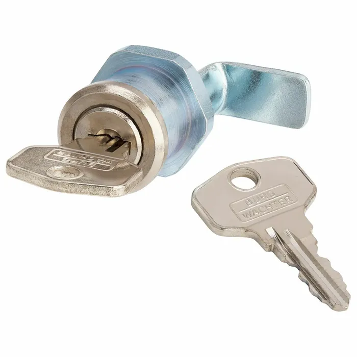 The BURG-WACHTER Art. ZS-77-H-SB. An all-round cam lock made of high-strength nickel-plated zinc diecast, disk cylinder with reversible key, cam adjustable at an angle of 90° with fixing nut. Each lock is supplied with two working keys and a single hinged shaped cam.
