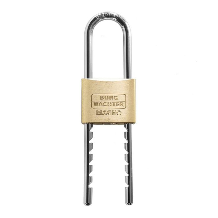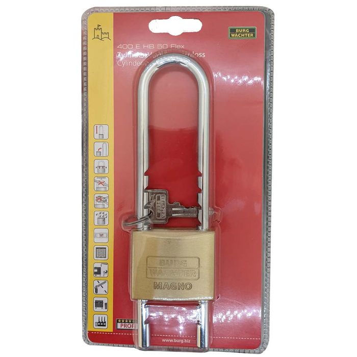 The BURG WACHTER "Magno Flex'" padlock is a large 50mm body padlock with a unique "Removable Shackle" with multiple locking positions (59mm - 149mm) allowing the product to be used in many different applications that even a standard padlock would not work in.