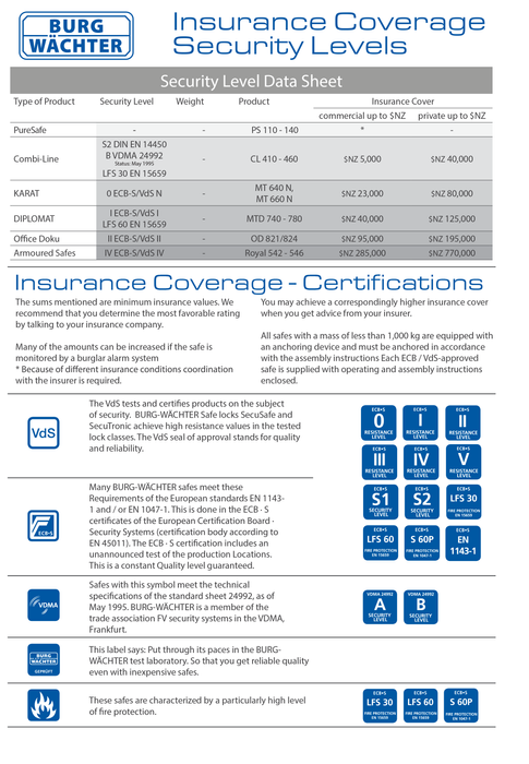 This chart covers the minimum New Zealand Commercial and Private insurance ratings for a range of BURG WACHTER safes. The chart also provides an explanation for different stickers and ratings values that appear on the models listed.