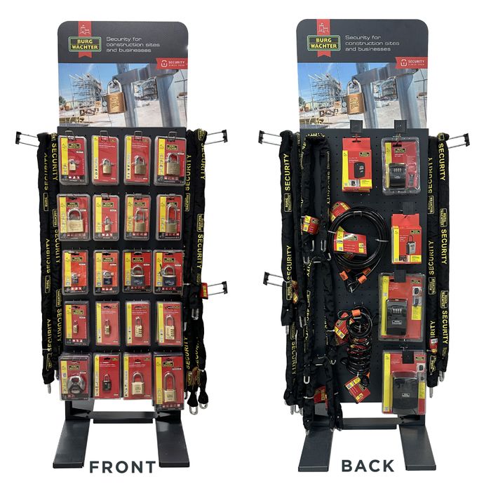 This eye-catching shop display showcases the most popular products from the BURG-WÄCHTER range by category including Security Chains, Combination Padlocks + More.
