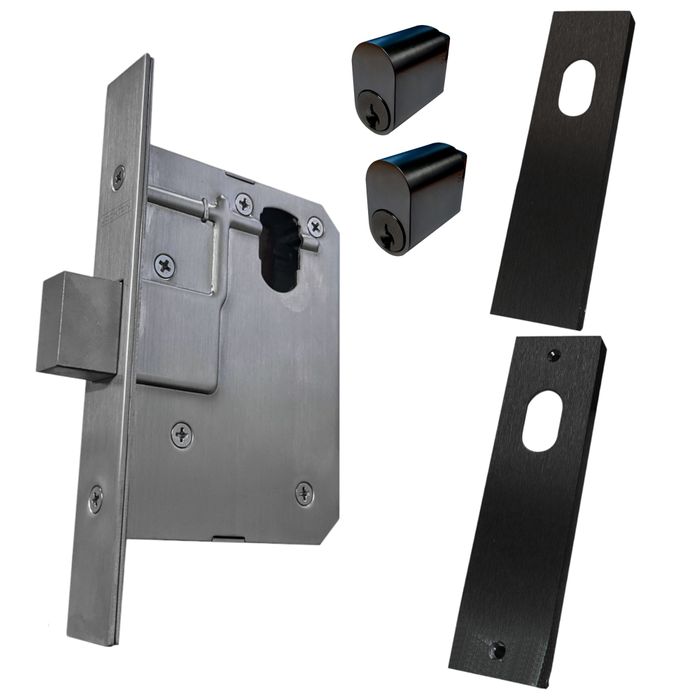 The LOCKTON 60mm Deadbolt Mortice Lock KIT 4 (DOUBLE CYLINDER) contains a LOCKTON 60mm Backset Deadbolt Mortice Lock, Oval Cylinders and suitable furniture, with Matte Black finishes.