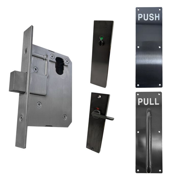 The LOCKTON 60mm Deadbolt Mortice Lock KIT 7 (INDICATING DA TOILET) contains a LOCKTON 60mm Backset Deadbolt Mortice Lock, Push/Pull Plates and suitable furniture with Matte Black Finishes.