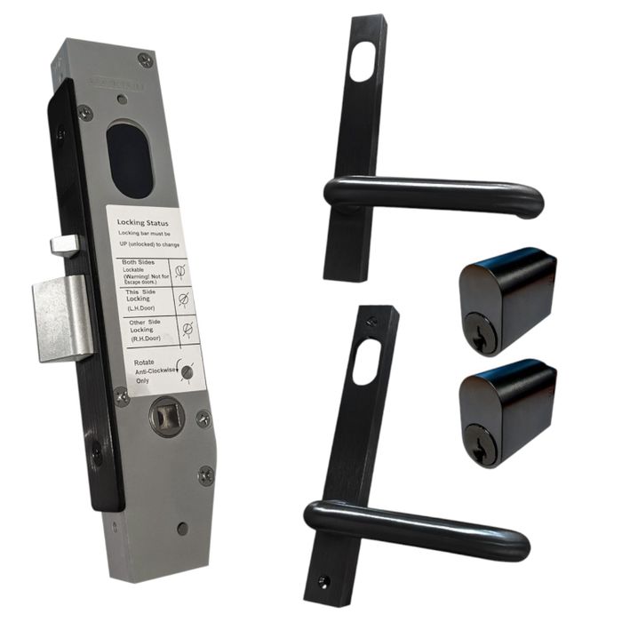 This is a Kit that contains a 23mm Backset Mortice Lock, Oval Cylinders and Suitable furniture, all with Matte Black Finishes for use in "Double Cylinder" configuration.