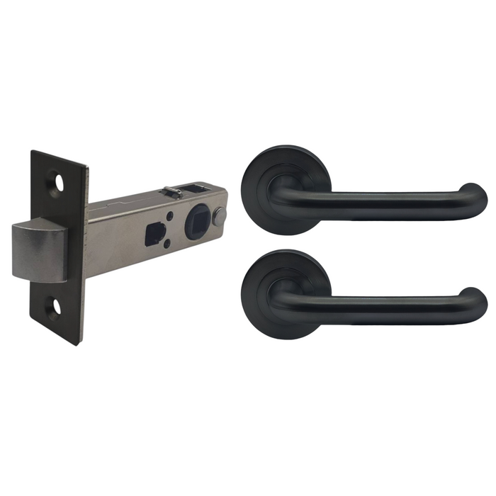 The LOCKTON Round Rose LATCH KIT 3 Black (PASSAGE) contains a LOCKTON 60mm Heavy Duty Passage Latch and Round Rose Passage Leverset, all with Matte Black Finishes.