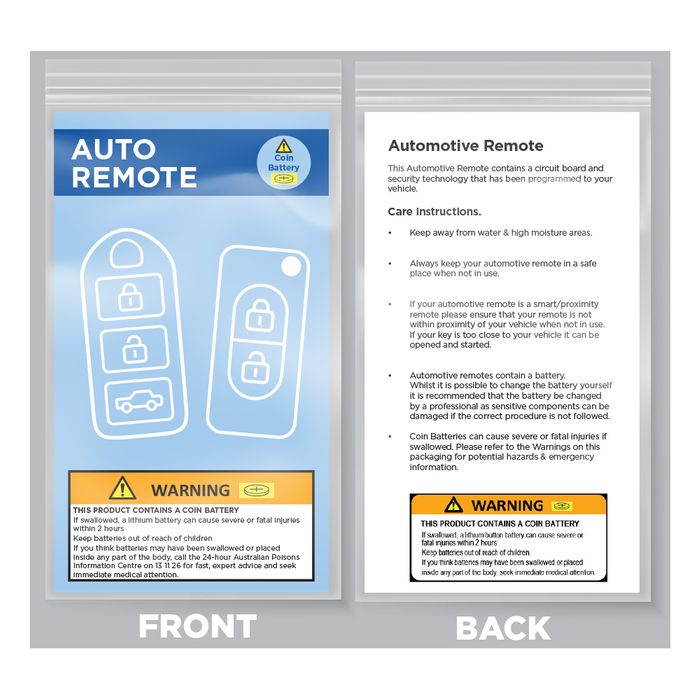 Automotive Remote PACKAGING - with Care Instructions & Coin Battery *Warning* Labels