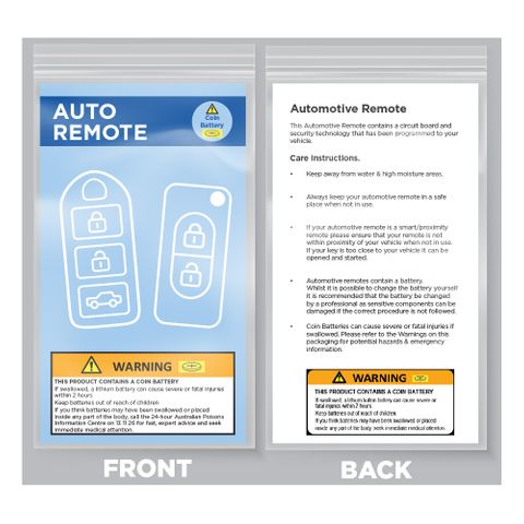Automotive Remote PACKAGING - with Care Instructions & Coin Battery *Warning* Labels